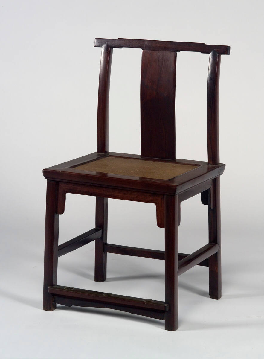 DescriptionStraight-backed chair with a plain splat, cane seat and brass plate on stretcher