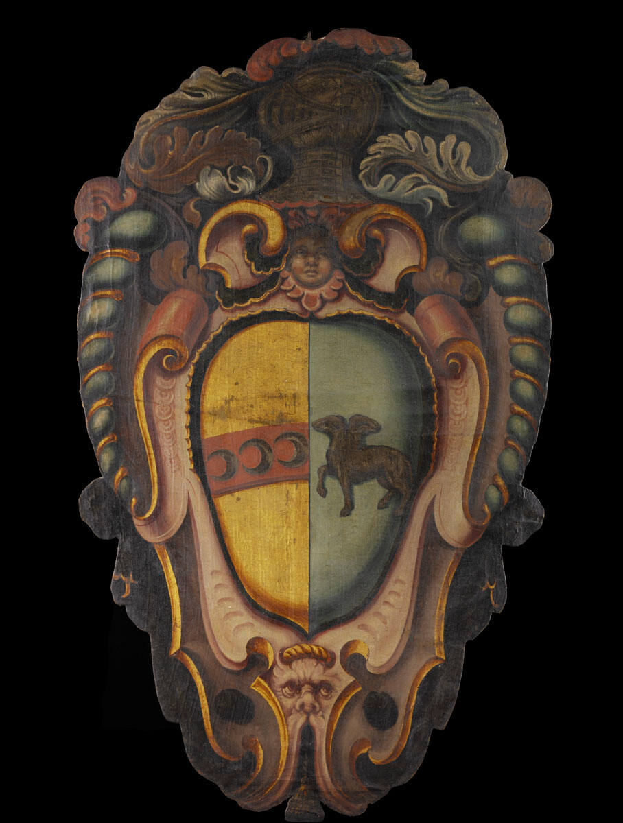 DescriptionShield-shape escutcheon surmounted by helmut and plumes. Coat-of-arms unknown.ProvenanceWith Orselli, by September 9, 1930 [1];