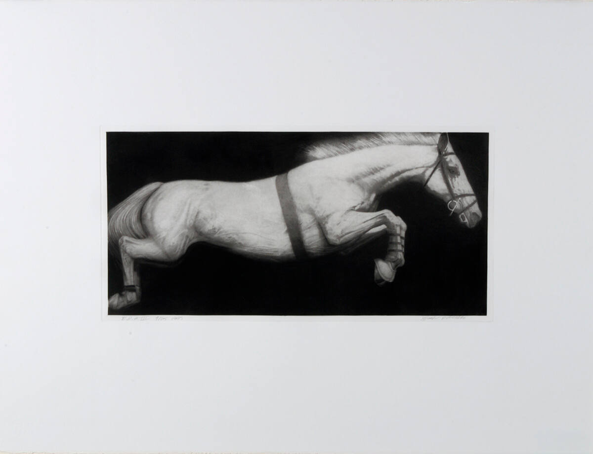 DescriptionAgainst black background, white horse jumping to right, fore- and hindlegs tucked in. Bridle, band around body, three bands on forelegs, and two bands on hindlegs in dark gray.Copyright© Estate of Joseph Piccillo