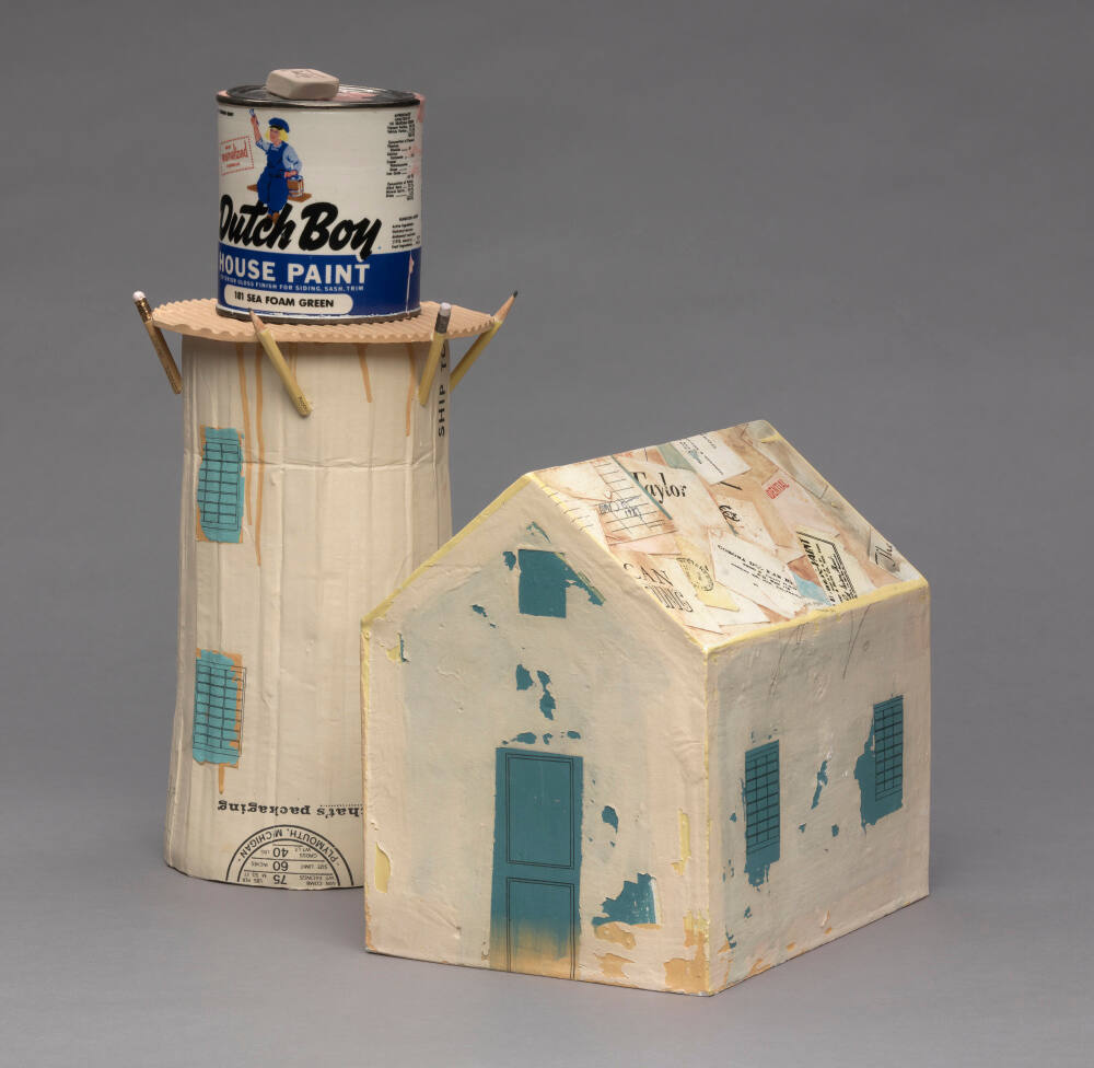 DescriptionTwo separate tromp l'oeil pieces. Cylindrical form of cardboard with pencil marks, package stamps and light blue shipping invoices. pencils stick out and upward, having been poked through from inside. circle of cardboard balanced flat, held in place by the pencils. cardboard circle is a can of Dutch Boy paint with spots of pink paint. of the paint can is a "Pink Pearl" eraser. house form of cardboard with pencil marks and light blue shipping invoices. Roof of house is covered with miscellaneous scraps of ovGallery Label