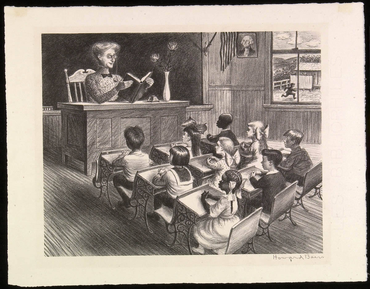 DescriptionInterior scene of an old school house. At the front of the class the teacher sits at her desk and reads to the children who sit with their hands folded on their desks.Copyright© Estate of Howard Baer