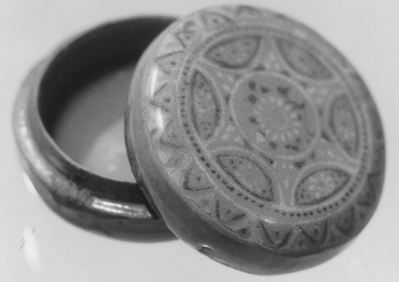 DescriptionGreyish body; celadon glaze inside and out; inlaid design; on lid: chrysanthemum in white, enclosed in a circle within a run of half-circles.