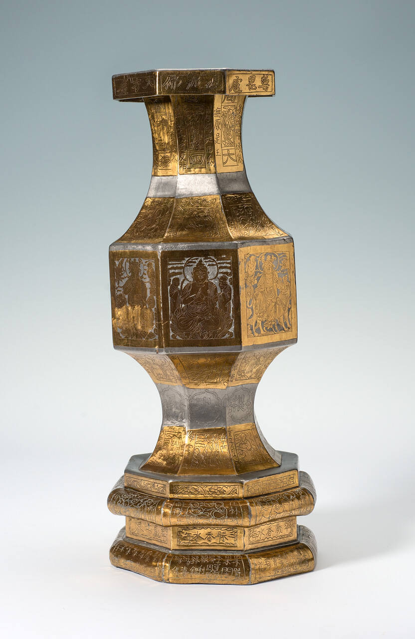 DescriptionOctagonal vessel; two-tiered base rising to broad belly, constricted neck, broad, everted lip; incised decor divided into registers and sections depicting various Buddhist deities, so identified in inscriptions.