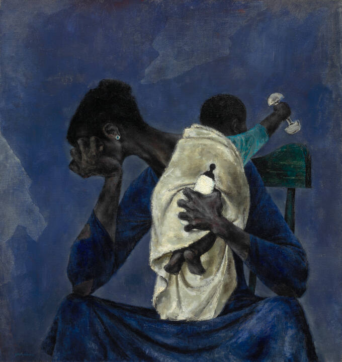 Joseph Hirsch painted Lynch Family as a response to racial disturbances in the South in 1946. That year the number of lynchings rose from an all-time low in January to a fevered pitch by August. Citizens across the country urged President Truman and Congress to end the horrors. To capture the tragedy of Lynch Family, Hirsch presented a mother with her baby, presumably survivors of a lynching victim, in abstracted surroundings. The painting focuses on the mother's intense yet restrained hold on her defiant child while she turns to hide her anguish. The blue background floats around the figures. It both highlights their pain and contrasts with the sheer beauty of Hirsch's painterly technique.