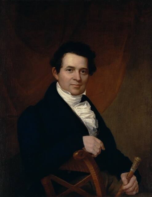 DescriptionHalf-length portrait of a man in a blue suit and white ruffled shirt, shown full face, seated in a chair with the right arm draped over the back of the chair and the left hand holding a stick. Red drapery in background.Gallery LabelSamuel L. Waldo studied with Benjamin West in London before establishing a successful portrait studio in New York in 1809. Three years later Waldo formed a business partnership with his apprentice William Jewett. The pair ably served the city's growing middle class by painting modest but flattering portraits until Waldo's retirement in 1854.