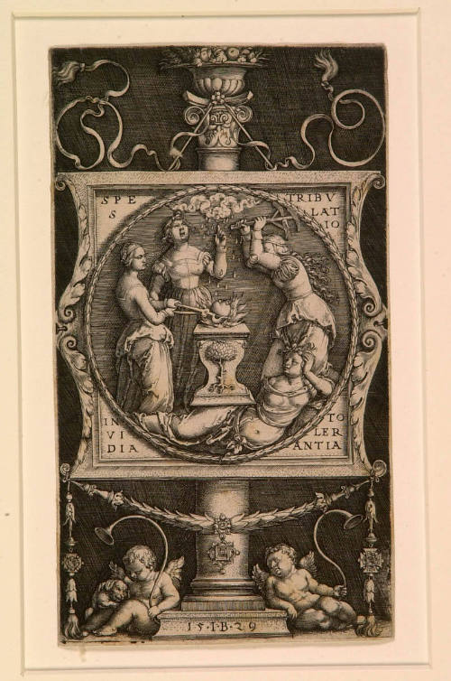 Gallery LabelThe design of this engraved bookplate was probably conceived by Nuremberg’s leading classical scholar, Willibald Pirckheimer (1470–1530). The central image is an allegory that urges patience during trying times. Female personifications of Tribulation and Envy hammer at an anvil that bears Pirckheimer’s coat of arms, a birch tree. Tolerance shoulders the brunt of this assault with great composure. Hope offers comfort by pointing to the rain shower that provides the flaming heart with relief.