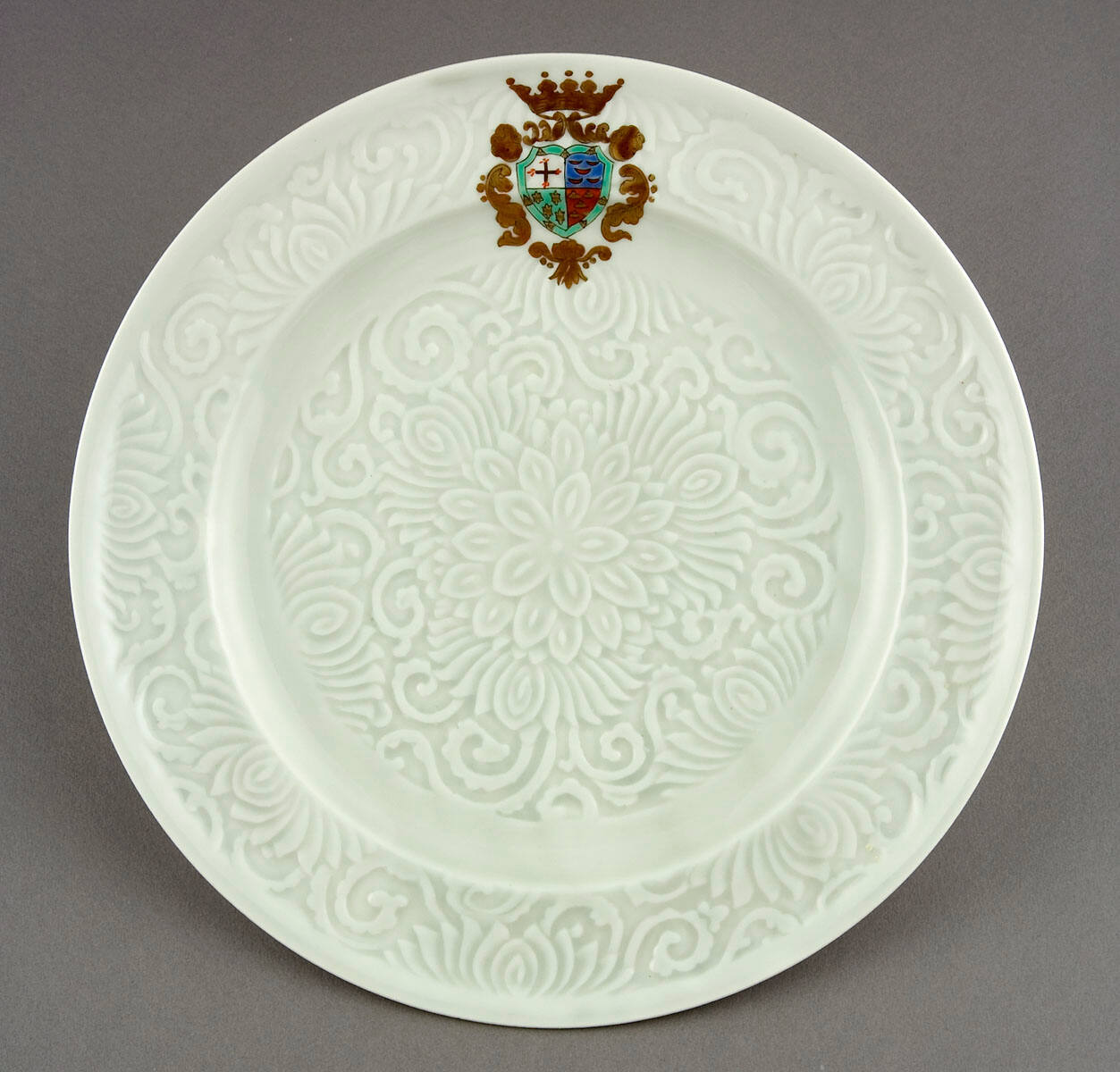 DescriptionPlate with depressed center and 1 1/4 " wide rim, raised white on white patterns of floral, S and C curves on rim and in center, smooth areas at outside edge of rim and outer part of depressed area, armorial design in gold leaf, red, blue and green placed at one side.