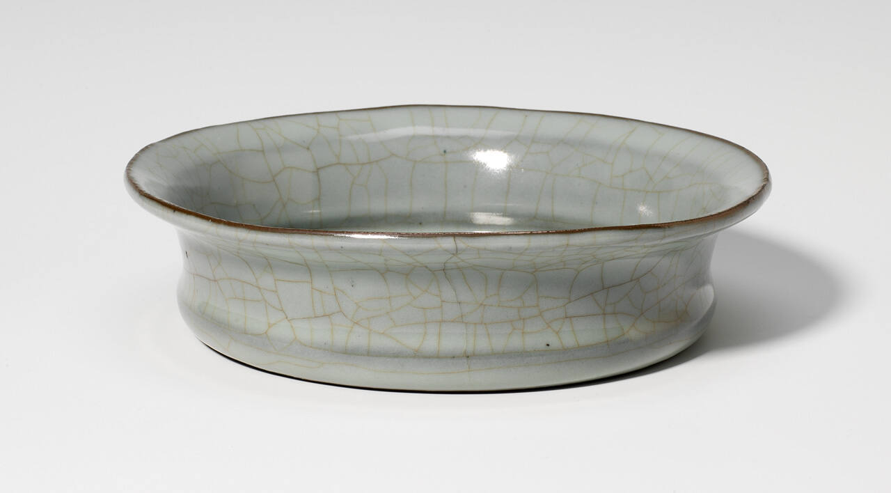 Description"Kuan" or "official" ware. Grayish blue glaze, all-over crackle. Flat bottom bowl with sides that flare out at the top. Lip and edge of foot reveal dark body.