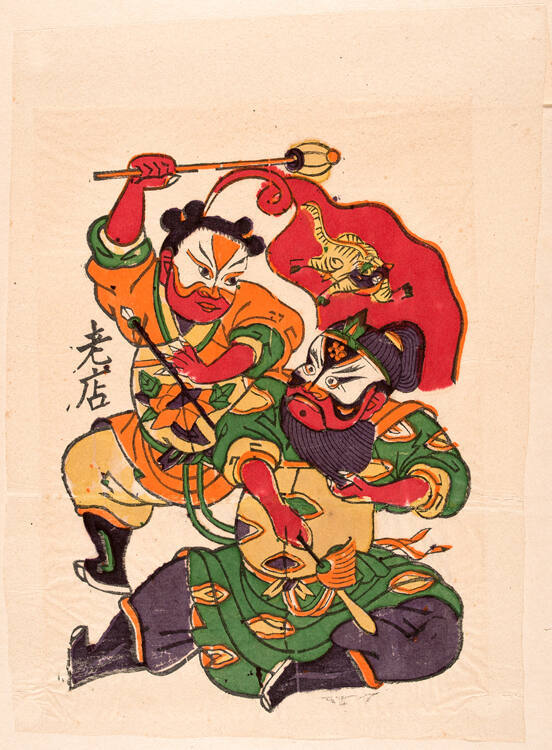 Gallery LabelIn Chinese opera, male military characters usually have their faces painted with colorful patterns. Face-painting offers information about the characters being portrayed, such as their identity and temperament. Here, the standing figure with a white-and-red-painted face is a young warrior. He defeated a senior general, whose face-painting is a different pattern. The print is one of a pair to be pasted on door panels or hardwood furniture.