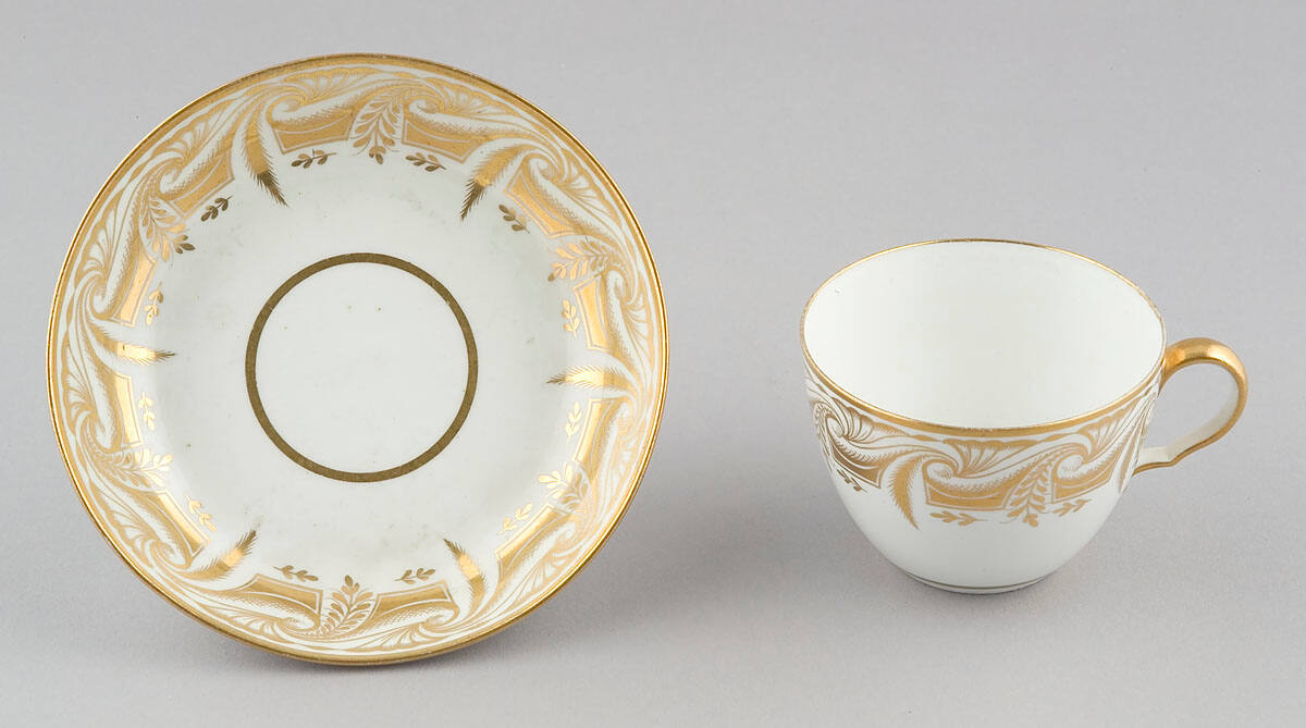 DescriptionCup: of white porcelain, gilt handle, decorated around top with wide border of gilt in formal design, and continuous leaf pattern. Saucer: of white porcelain decorated on inside with gilt border in formal design, and continuous leaf pattern.Provenance