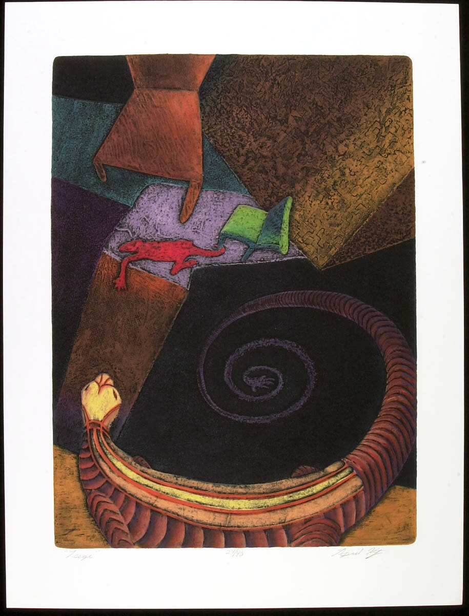 DescriptionAbstracted interior scene with a red lizard (?) and a coiled reptile resembling a snake with legs.Copyright© April Katz