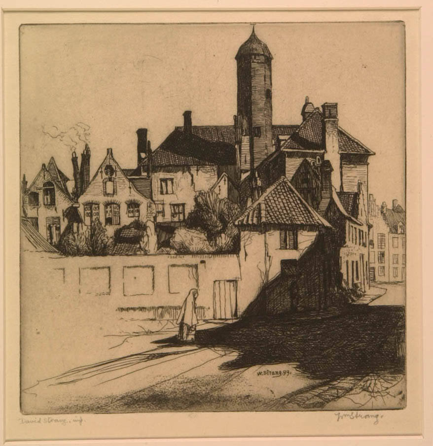 Gallery LabelThe finely preserved medieval town of Bruges was a favorite site for artists, and was seen as a kind of time warp from a bygone age. Today it is thronged with tourists, but a century ago its streets were often silent and quiet, a feeling captured in this print. Perhaps the quiet austerity of his deep shadows is evidence of William Strang’s Scottish heritage.