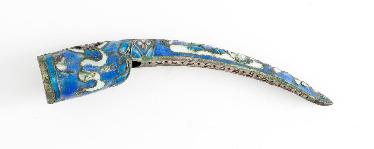 DescriptionSilver fingernail protector decorated with blue and white enamel.
