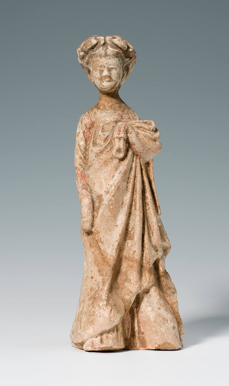 DescriptionFigure of a lady in voluminous robes, with the skirt gathered up in a bunch over the left arm, a wide scarf over the shoulders, and an elaborate headdress. Slight traces of cream glaze and polychrome.