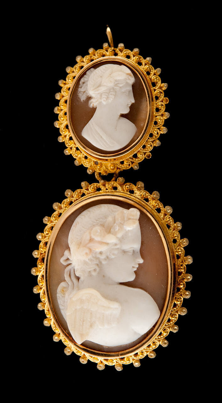 DescriptionOne of a pair of earrings for pierced ears of two oval brown cameos with white classic heads set in gilded copper, suspended on below other.ProvenanceLinda S. Hall (1859-1938), Kansas City, MO, by 1938;