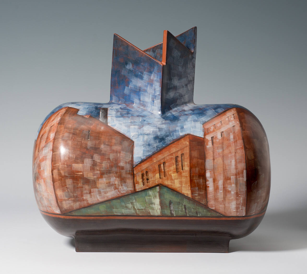 DescriptionHorizontal, tank-like form on two long, short feet. opening on top with two pointed edges and one curved edge. dark grey. scene of old red-brick warehouse buildings set against a blue sky. green areas. grey smokestack and the other long side has two. water tanks on tops of buildings. Triangular stem blue with orange edges. Transparent white accents overall in short, square strokes.Gallery LabelIntrigued by the vistas of overlapping rooflines in New York, Lidya Buzio applies images of buildings and towers onto her works in subtle tonalities inspired by Roman frescoes. Here, earth-toned structures rest on a green ground beneath blue skies, which rise to form the angularly notched neck. The two-dimensional scene is rendered in perspective, creating an illusion of spatial recession. The curves and swells of the piece's form provide a third dimension to the cityscape. The polished surface and consistent feathered brushwork further animate the vessel.