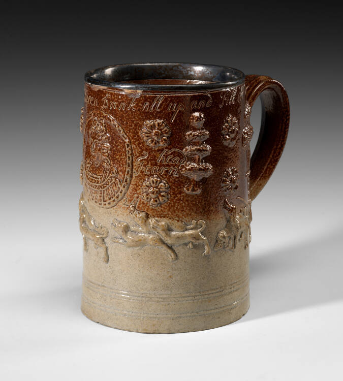 DescriptionCylindrical form with loop handle and silver-plated edge. Upper half covered with dark brown wash and decorated in low relief with meallion portrait of Queen Anne with molded Stuart roses. Lower half, white, decorated with scene of stag hunt, including molded figures of hounds. Inscribed below edge "This is to ye pious Memory of Queen - Drink all up and fill itt again." Also inscribed "Bartho. head/Fearn."Gallery LabelThis tankard is decorated with a relief portrait of Queen Anne (reign 1702-14) and a stag hunt. The inscription around the rim reads: "This is to ye Pious Memory of Queen-Drink all up and Fill itt again".