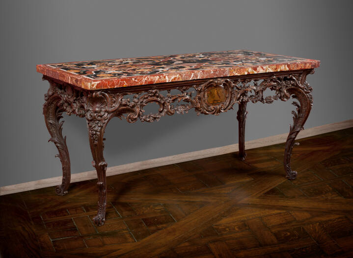 While the 18th-century painter combined oil paints on the canvas, the pietre dure (hardstone) artist looked to the abundant palette of semi-precious stones to laboriously form a virtually permanent image. Echoing the themes, styles, compositions and palettes expressed in painting, elaborate designs of nature were "painted" with stone. This table's curvilinear forms of scrolls, shells and foliage illustrate the Rococo style popular in 18th-century England and the continent. Belonging to the Whitmore family of Apley, England, as indicated by the falcon family crest painted on the table's carved base, this marble top may have been commissioned during a Grand Tour. This extended journey through the ancient and modern sites of continental Europe was considered essential to a cultured man's education.