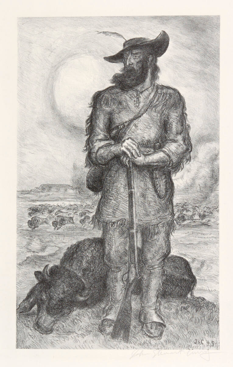 DescriptionThe plainsman stands in the center of the image with his gun. Next to him is a dead buffalo, and in the background, more buffalo are stampeding.Copyright© John Steuart Curry Estate / Kiechel Fine Art