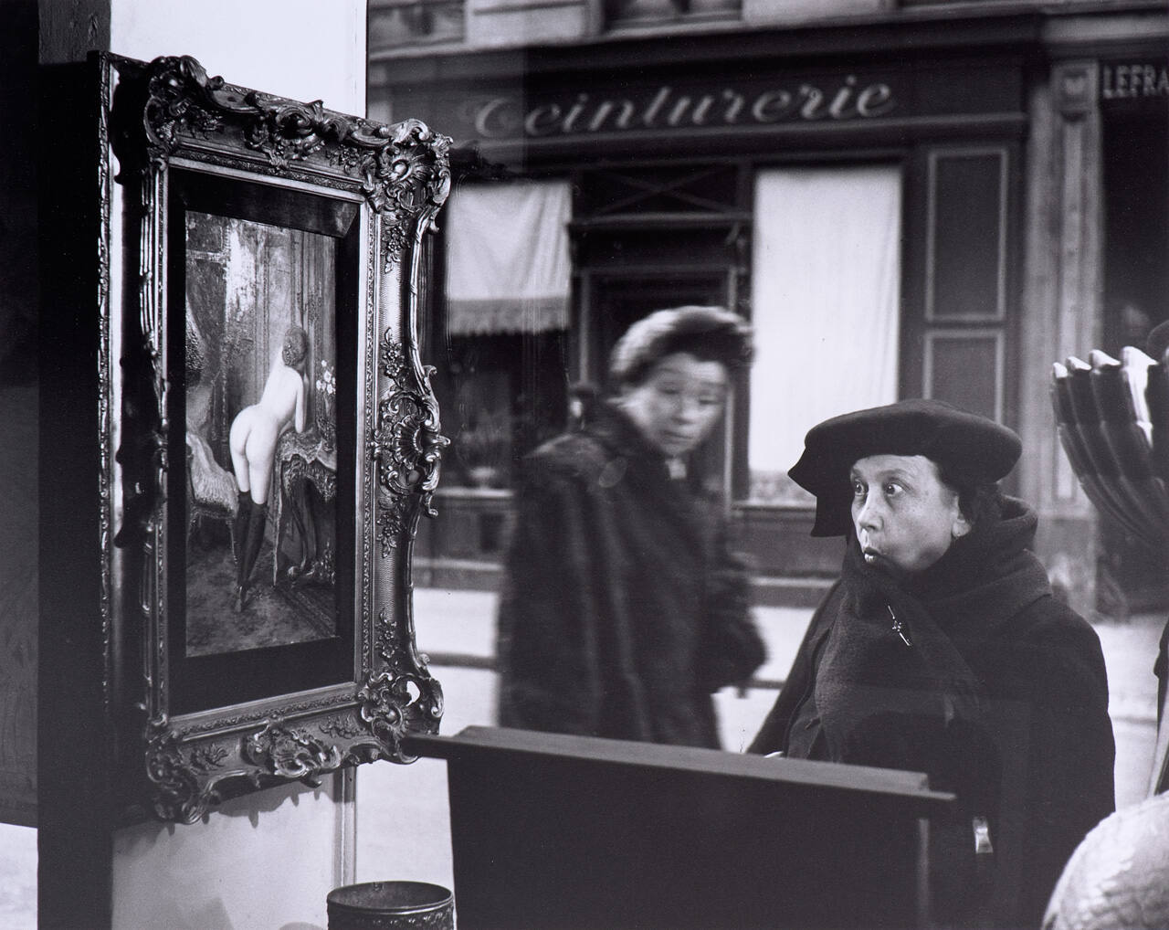 DescriptionImage of a woman looking through a store window at a painting that depicts a nude female from behind. The woman is dressed in a dark coat and hat, her eyes are wide and her lips pursed as she gazes at the image.Gallery Label“It was a little provocative in those days to put such a picture in the window,” Robert Doisneau said about a risqué painting hanging in a friend’s antique shop. “I saw that a lot of people glanced at the painting in the window, and their reactions were quite amusing. I thought it would make a good photo-series … I arranged with Romi [Doisneau’s friend] to sit in the shop, holding the Rolleiflex [camera] on my knee, to see if I could get some good pictures. Because there was a reflection in the window, passers-by couldn’t see what I was doing.”