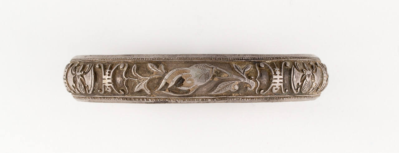DescriptionCarved silver bracelet with fish, flowers and animals in half round.