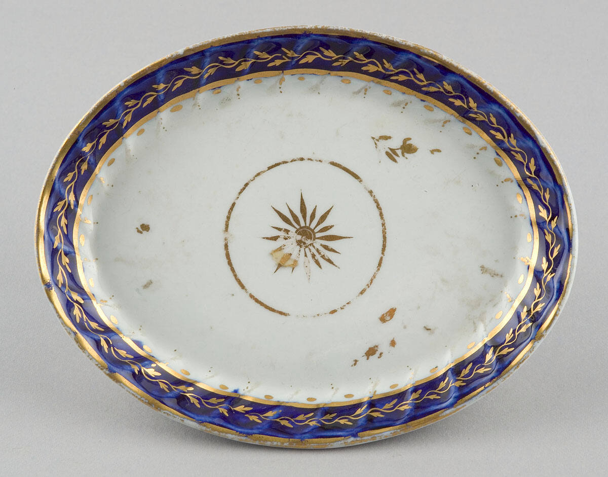 DescriptionWhite oblong body with vertical, fluted sides. Dark blue border along shoulder with gilt borders and foliate decoration. Gilt ring around bottom; gilding around rim and on handle. Oblong plate with blue border on interior, fluted rim; gilt circle enclosing sunburst pattern; gilt flowers.
