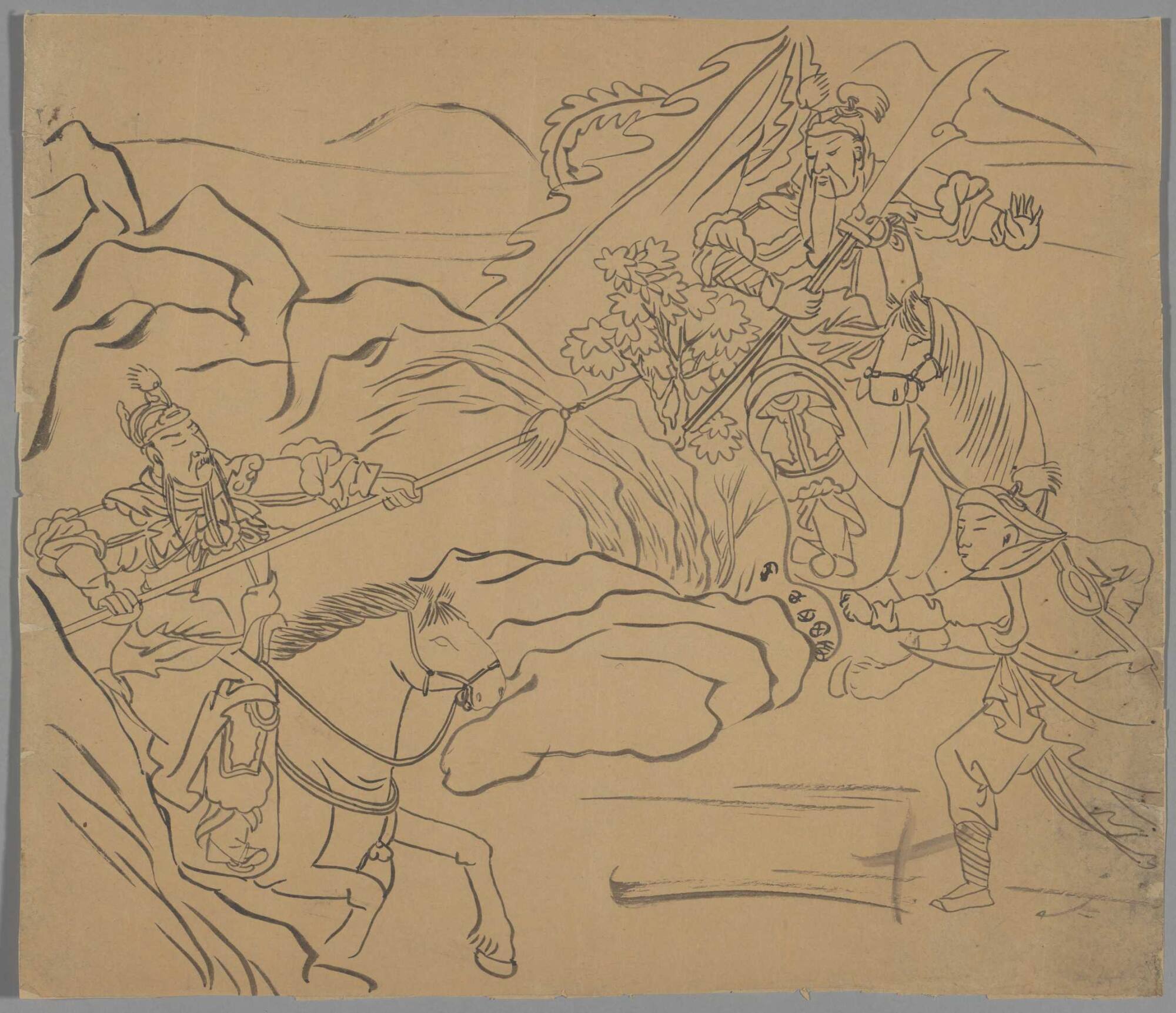 DescriptionTwo horsemen, one with spear, the other with dagger-ax; foot soldier approaching from right; landscape in background.
