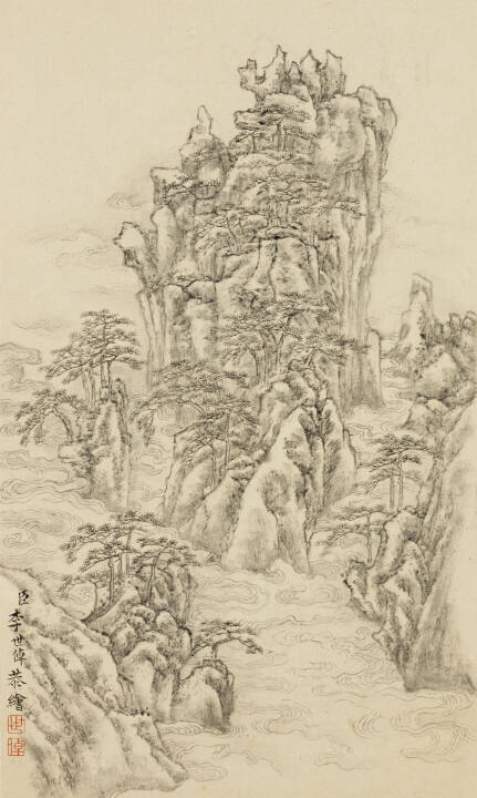 Gallery LabelLi Shizhuo was a Manchu official who learned brushwork from celebrated literati artists of his day. His paintings continue the classic landscape traditions, but at the same time, they demonstrate an individual sensibility in the dry brushstrokes that sculpt the boulders and cliffs and the fine lines that describe the curvilinear patterns of clouds and water. In general, his use of color also follows literati tradition, which employed it sparingly, more to add emotional intensity to a scene than to enhance its descriptive purpose. The bold use of flame red in the painting of sunrise, however, is unprecedented and seems to reflect a new interest in representing more realistically the shifting moods of nature.