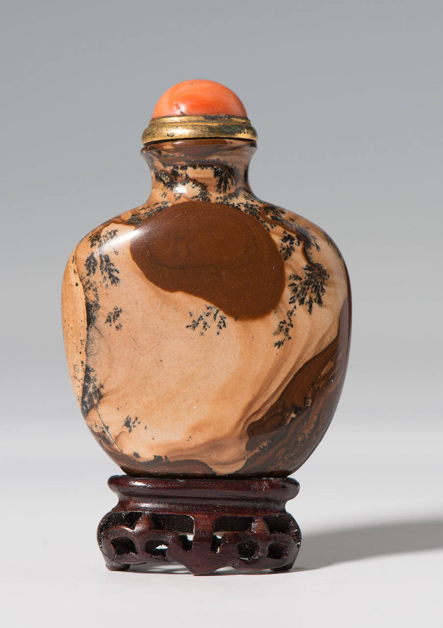 DescriptionOf flattened spade shape, with flared neck, resting on a neatly finished foot, the brown stone suffused with creamy pools and wispy mosslike inclusions.
