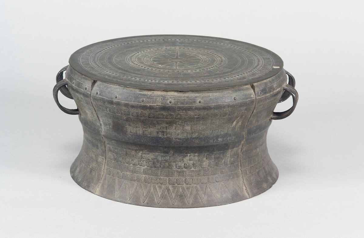 DescriptionDrum with a circular motif around the top, circular motif around the bottom, and loops attached at the sides.