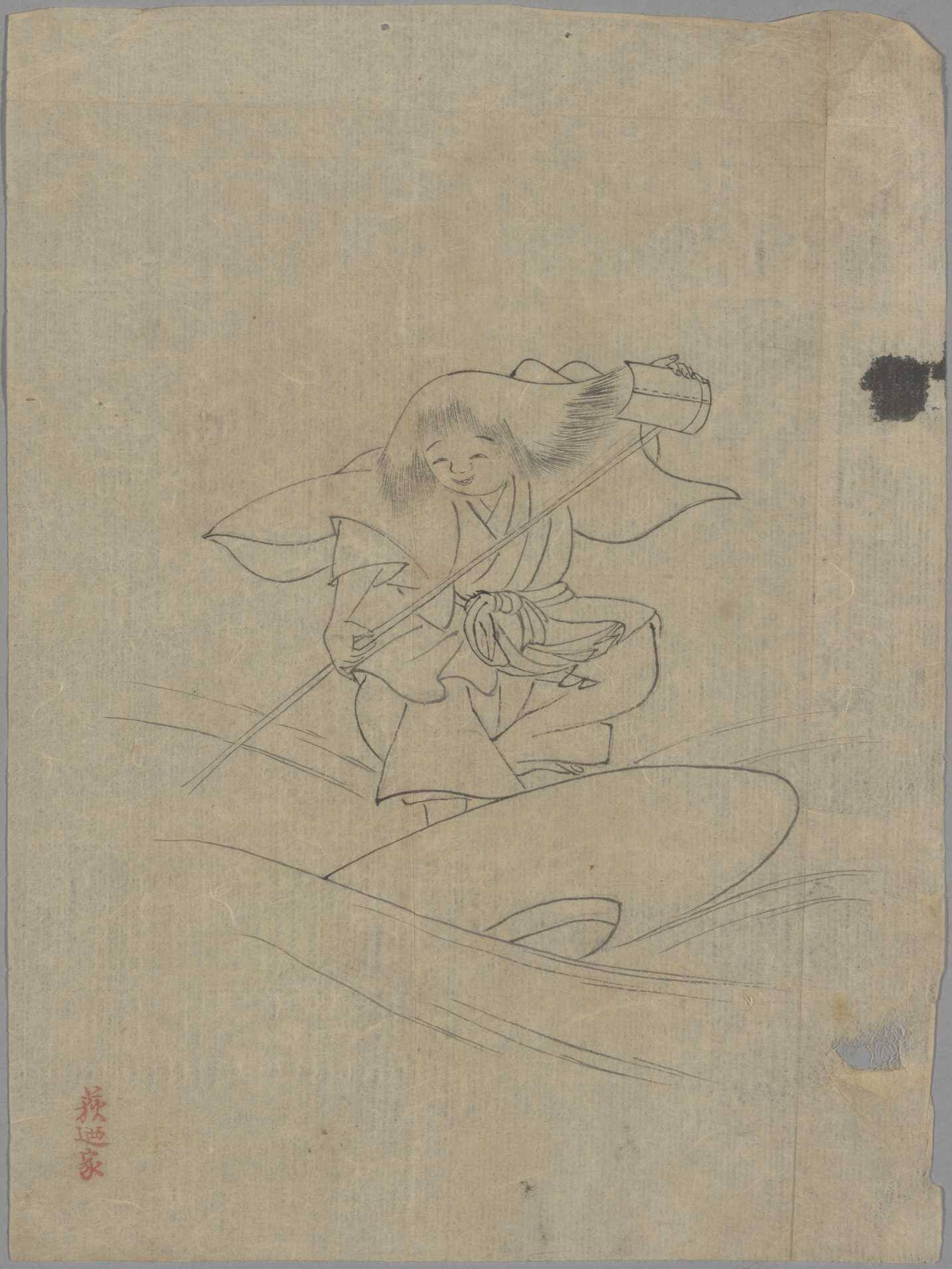 DescriptionRobed figure with flowing hair holding long-handled scoop, on round support in waves inscription in red.