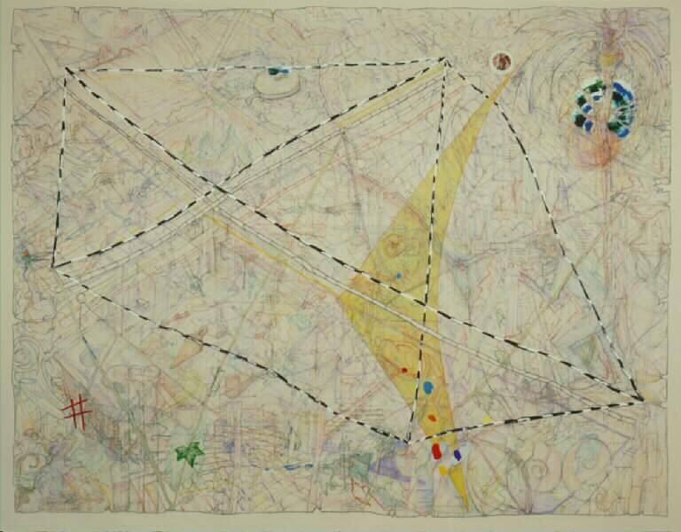 DescriptionAll-over drawing which includes a man surveying, center right; seashells in lower right; animal with ring in nose, upper right; a red # in lower left. An elongated yellow-gold triangle in the right half; a black-and-white surveyor's chain criss-crosses the surface throughtout.Copyright© William T. Wiley