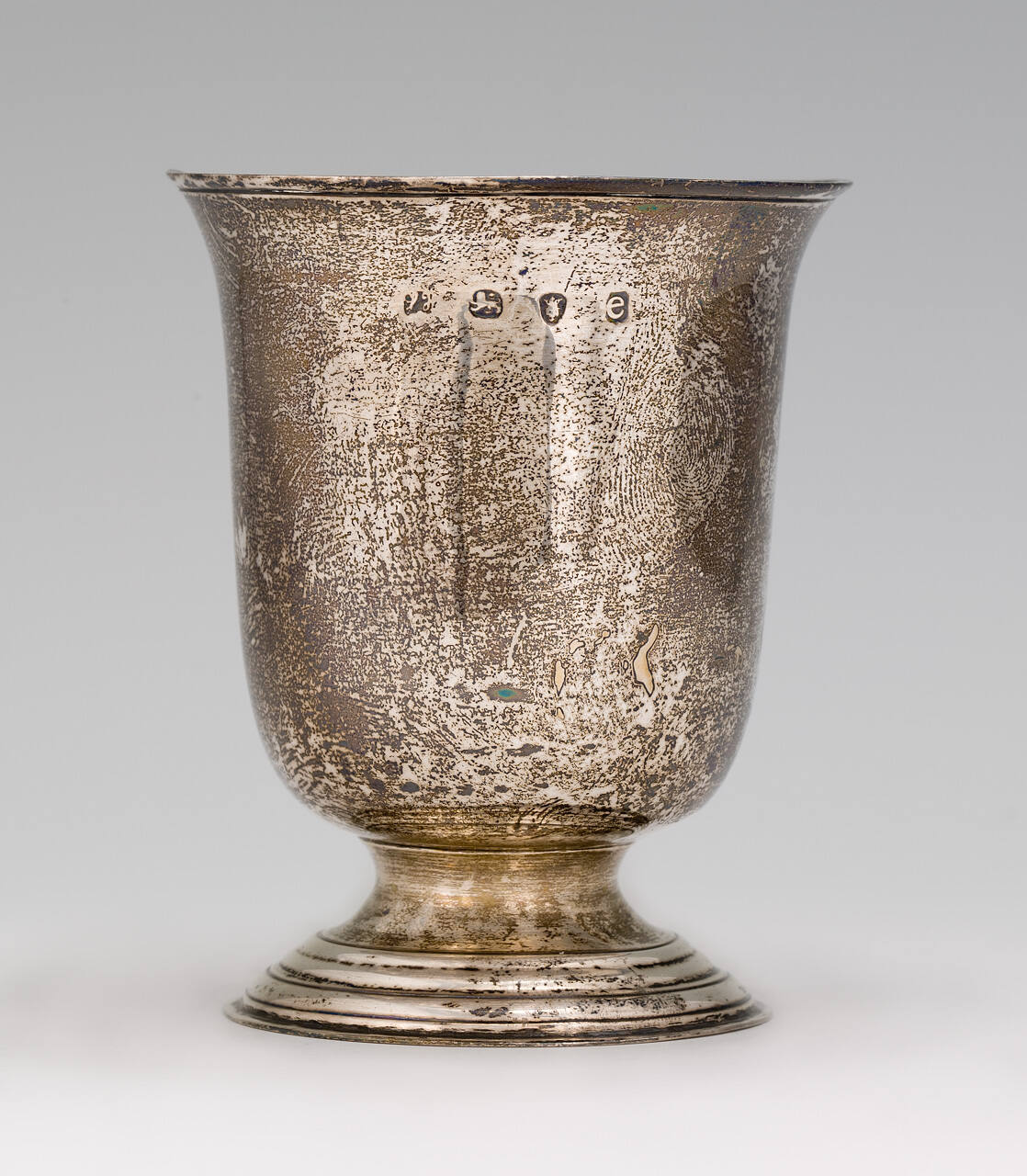 DescriptionCylindrical shape with slightly inverted lip; circular, tiered foot; slight interior gilding. Marks on exterior below lip: HB (?, rubbed), lion passant, leopard's head crowned, date.