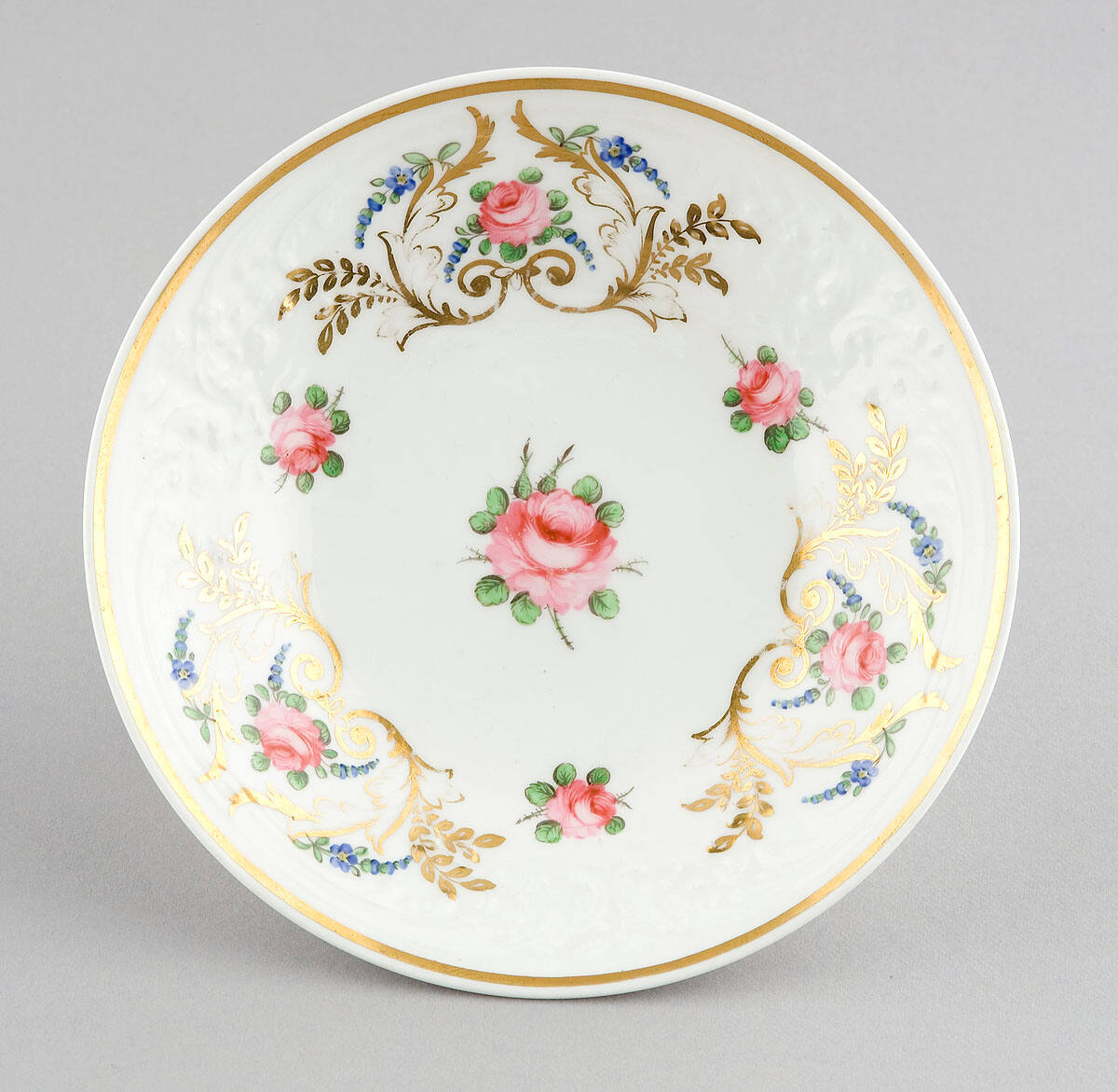 DescriptionSaucer of white porcelain with impressed floral design and decorated with flower and leaf patterns in enamel and gilt. A single rose in the bottom.ProvenanceMargaret Cameron Chapman (née Mann, 1865-1935), Kansas City, MO, by 1935;