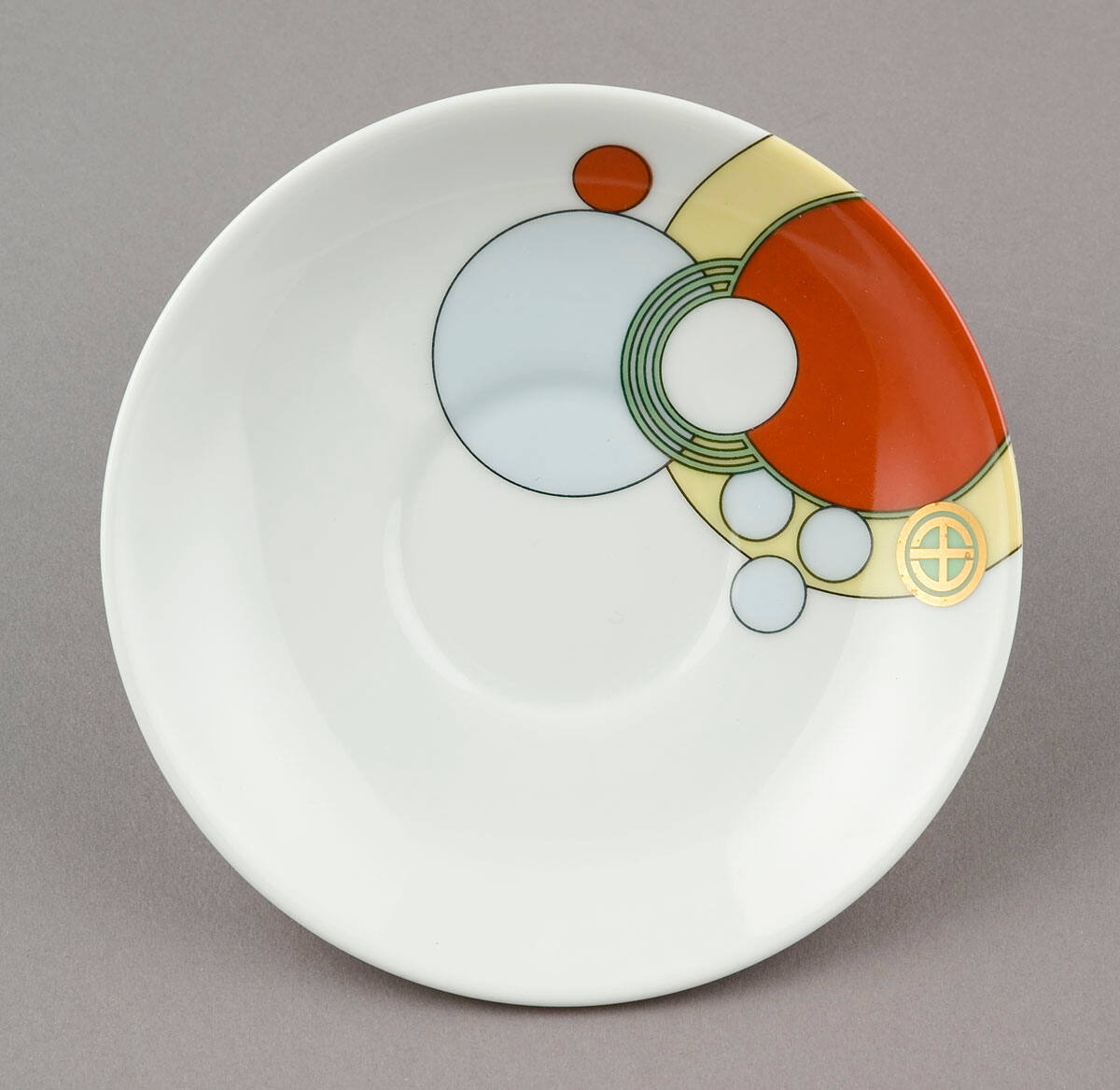 DescriptionWhite porcelain with patterns of overlapping and intersecting circles delineated by thin black lines and colored in light grey, red, yellow, green and gold.Copyright© Frank Lloyd Wright Foundation, Scottsdale, AZ / Artists Rights Society (ARS), New York