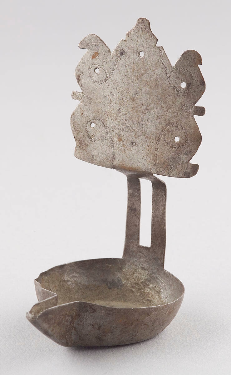 DescriptionTopped by escutcheon plates with hole at top and one in each quadrant, ea. hole surrounded by scroll in punched work; "P" punched in bottom front of each plate. Pick twisted at bottom, and with pike on end; connected by closed hook with hole in long handled section below plate. Riveted flat member on inner middle of long section with upward pointing hook. Short member has rectangular hold in handle. Both vessels shallow, round, with long, pointed spouts.