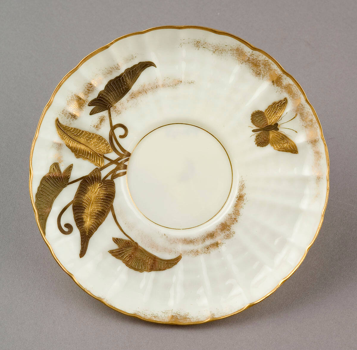 DescriptionDecorated with lily pads, butterflies, and dragonflies on a cream ground executed in raised gold, bronze and silver.