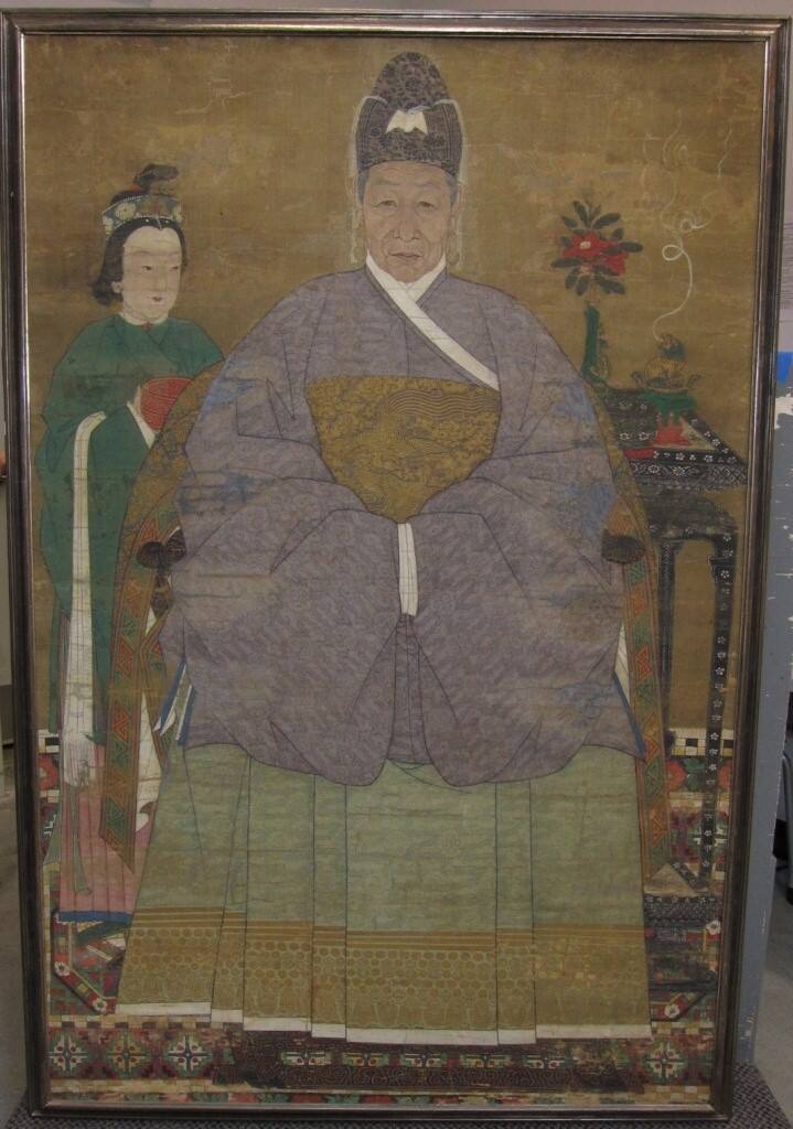 Many aspects of this portrait indicate that this woman was a revered ancestor who had lived a long and comfortable life. The symmetrical and rigid pose is typical of ancestor portraits. The golden phoenix on her ceremonial robe, gold jewelry and high tasseled hat indicate the high status of her family. Their affluence is reflected in luxurious items such as the red lacquer cosmetic box held by the servant and the lion-shaped incense burner on the lacquer table.