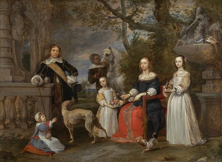 Gonzales Coques developed a portrait style that combined the intimacy of a small-scale painting with the grandeur of court portraiture. Here, this family displays their wealth by posing in a garden setting decorated with ornamental features taken from the artist’s repertoire of stock accessories. The black groom leading a horse does not necessarily represent an actual person, but would have been perceived at the time as a status symbol. Artists regularly inserted African youths into portraits even when their sitters did not retain black servants in their households.