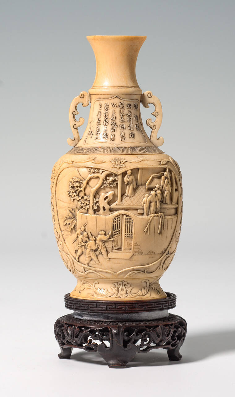 DescriptionAn off-white carved small baluster-shaped ivory vase. The neck is decorated with panels of carved poems, one about A Hsi on one side and one about Ch'en Hsi-chiu on the other. The body is carved with figural scenes: on one side are armed men entering the gate of a walled compound wtih a family inside a pavilion; the other shows a wheeled donkey cart acosted by three persons.