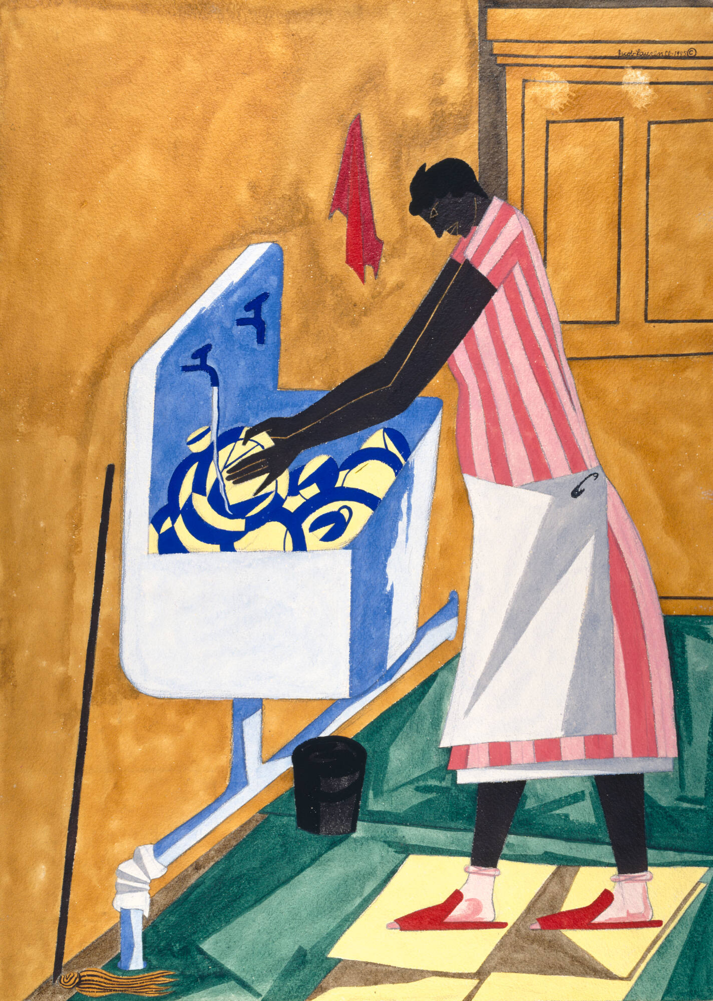 Gallery LabelShallow space, tilted perspective, and planes of flat color define Jacob Lawrence's Home Chores. Together, these elements depict a woman toiling over a sink of dishes in a Harlem, New York, housing project. Lawrence manipulated opaque watercolor to create the textures of the room. He rubbed away areas of green to create a textured floor and spread diluted wash across the yellow walls to achieve a mottled effect.