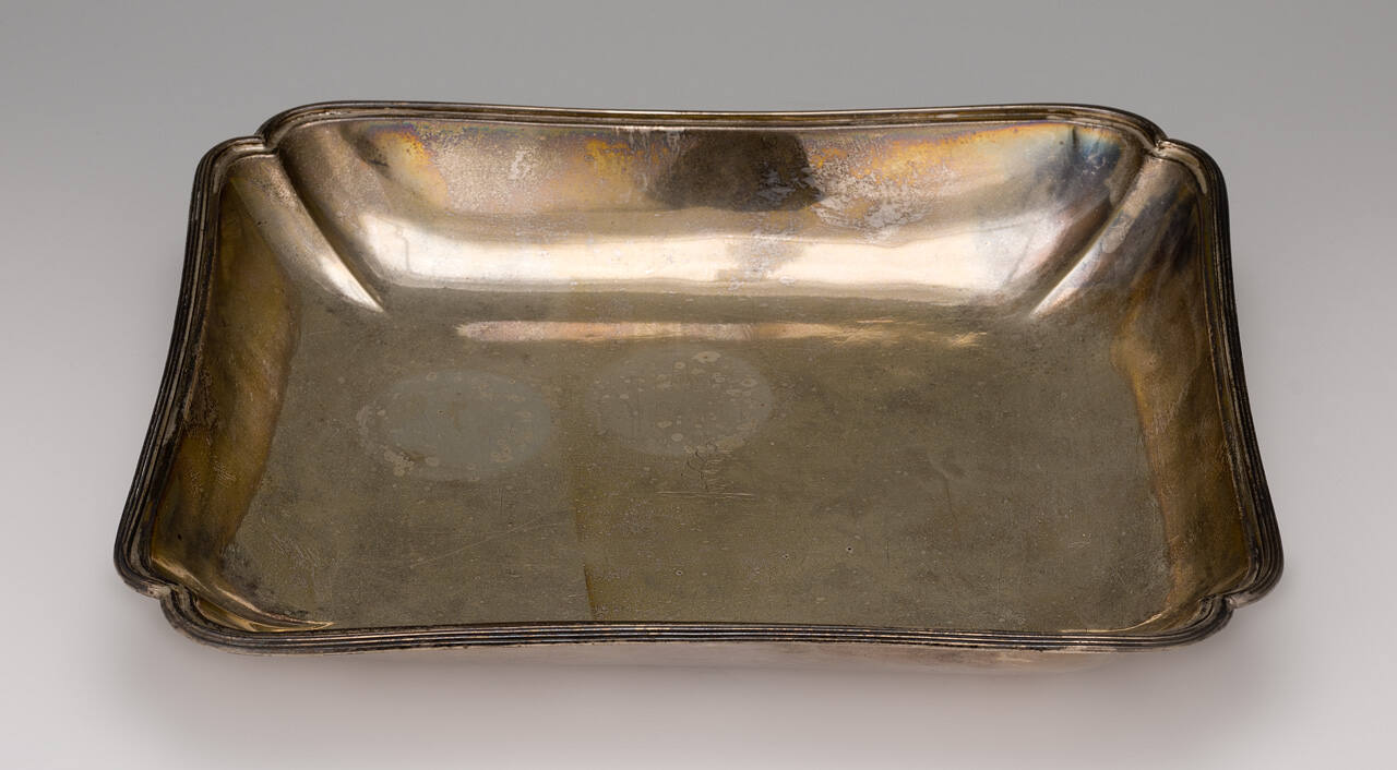 DescriptionShallow container with flat bottom and reeded rim indented at each corner; engraved leaves and stem design in center. Marks on underside: HC, lion passant, leopard's head crowned, date u, George III.