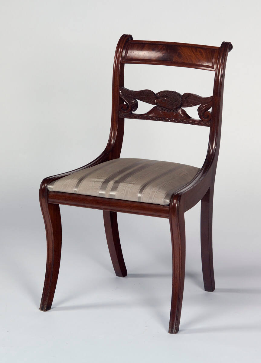 DescriptionDuncan Phyfe chair with curved back, fluted legs and frame. Carved eagle with spread wings on back. Upholstered in blue- and gold-figured Chinese brocade.