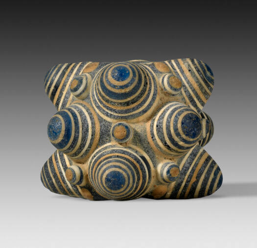 Glass beads imported from Western Asia begin to appear in China around the 6th century B.C.E. They were highly prized for their translucency and color and were often placed in the coffins of the elite or threaded through silk cords attached to bronze mirrors. The Chinese soon produced their own, chemically distinct versions containing significant amounts of lead and barium. The protruding "eyes" were built up by dripping droplets of molten glass onto the surface.