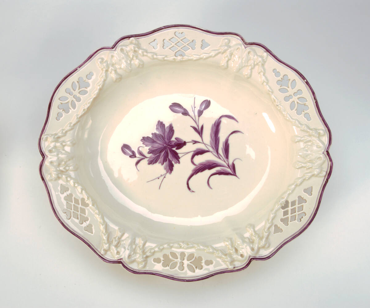 DescriptionSmall shaped oval contour plate with reliefs of swags and cascades. Purple banding on rims decorated with purple floral sprays. Pierced designs.Provenance