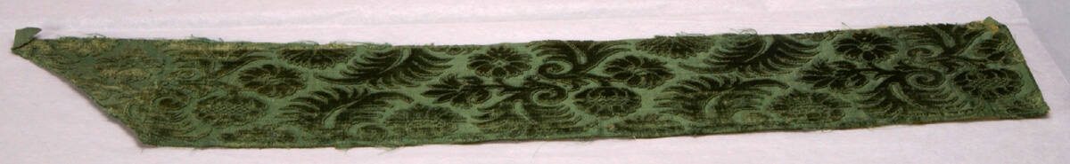 DescriptionAll over pattern of conventionalized leaf and flower form in dark green, light green backgound.