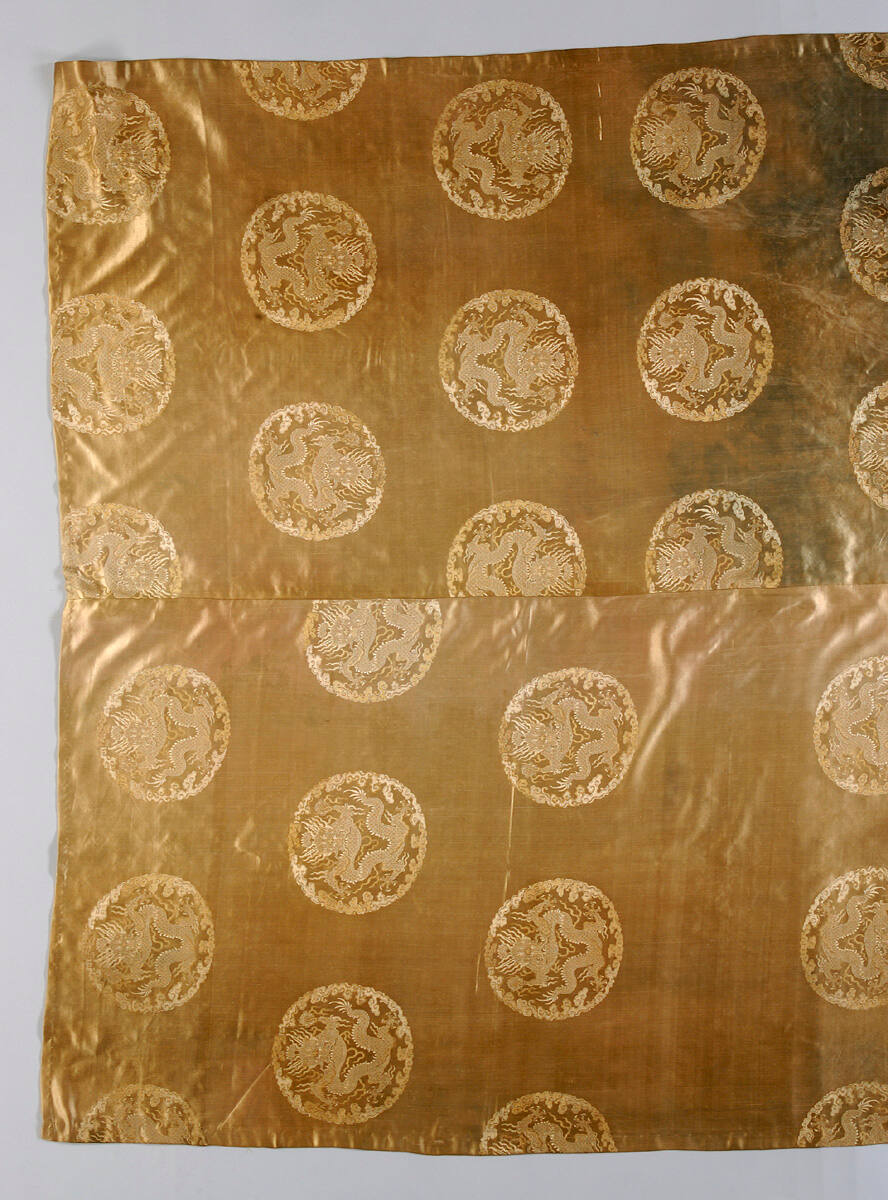 DescriptionSquare piece of tan satin, large circular medallion of dragons brocaded in brown. Blue stains. Possibly originally all blue.