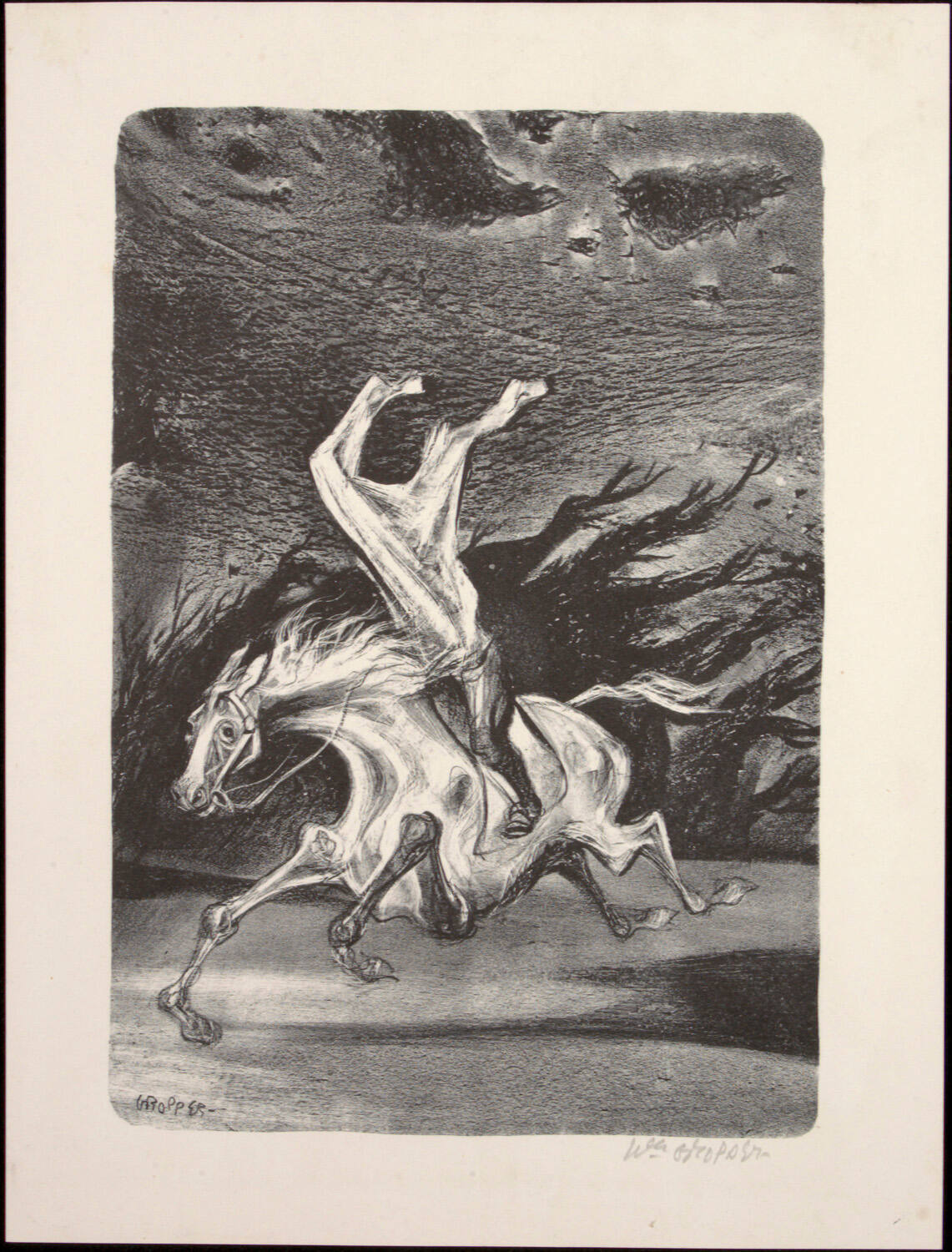 DescriptionFrenzied horse carries headless rider whose armless sleaves flap in the breeze.Copyright© Estate of William Gropper