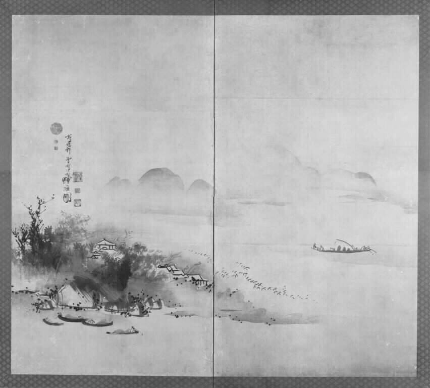 DescriptionSoftly washed, rounded mountains suggest distant background beyond a vast stretch of water on which a long, flat boat, loosely sketched, floats in the middle ground. A village nestled in dense groves of foliage stands on a spit of land that projects from the left to occupy the left, middle ground. Trees have been loosely sketched with a soft, ragged brush, well charged with diluted ink. Earth and rock formations broadly suggested with gradations of dilute ink. The artist played upon dark-light contrasts of amorphous forms. Irregular, overall losses and abrasions, with extensive losses bordering the hinge and along both edges; upper right corner has an insert of damaged paper which appears to be the same original paper; upper paper seams to not match.Gallery LabelA humble boat moves through a misty atmosphere. Dark flocks of birds add a sense of sound and motion, in contrast to the quiet, round silhouettes of mountains that seem to disappear in the distance. In the open riverscape, we find a populated area with houses and more boats offshore. These are visual elements and compositions Japanese artists adopted from the Chinese ink landscape painting tradition, which was in vogue among Japanese elites in the 1400s. Soga Shōhaku followed the convention, including ink of ranging density and brushwork. He also incorporated his own distinctly expressive use of ink near the boats on the riverbank.