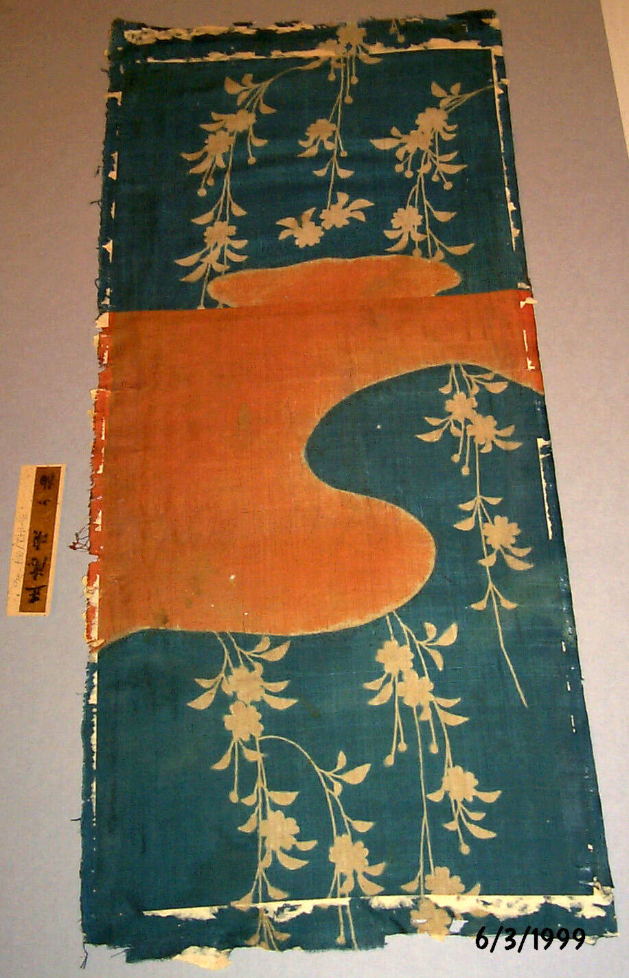 DescriptionPlain blue silk ground with cherry tree in paste resist dyeing and tie dyeing (red cloud). Design of a weeping cherry tree and cloud.